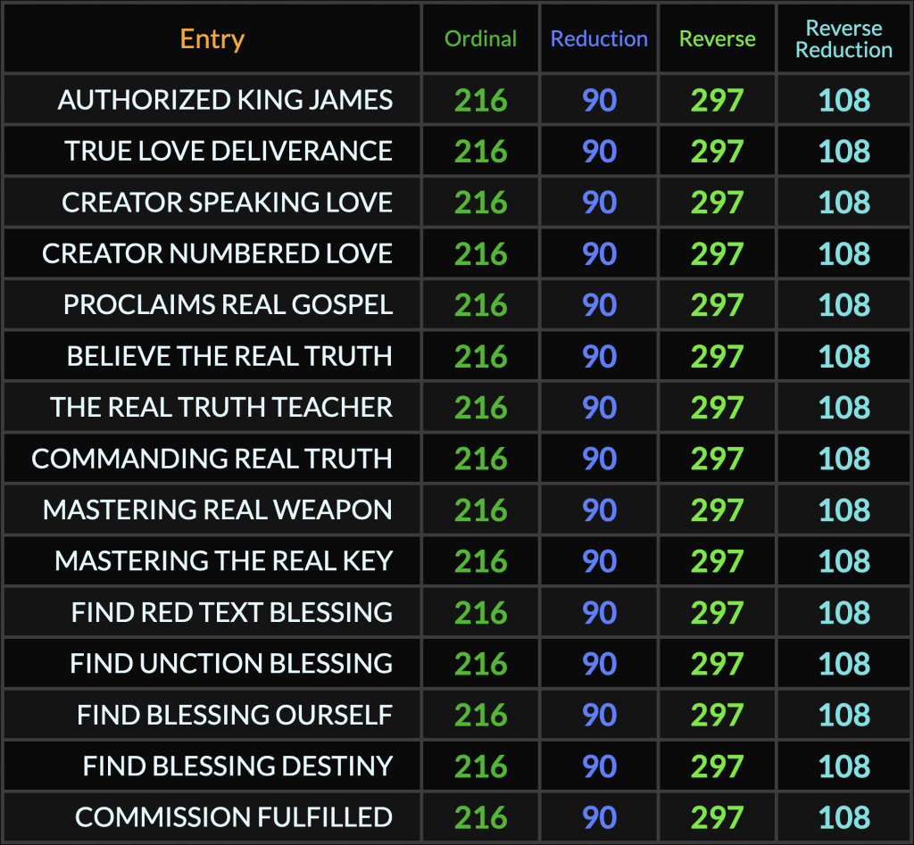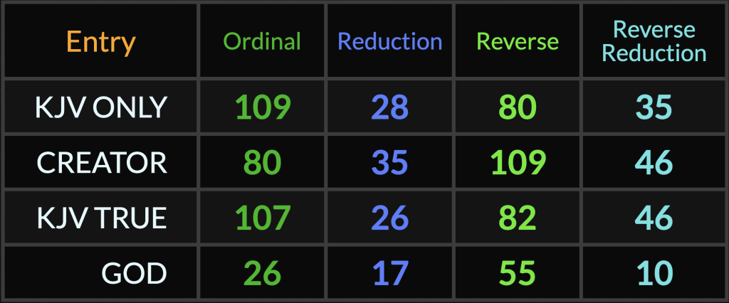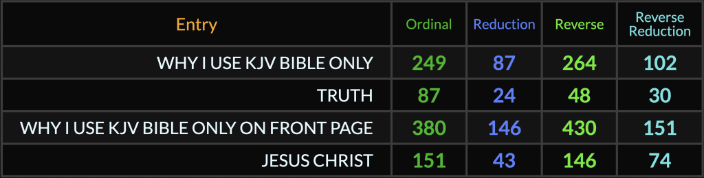 Notice that “Jesus Christ” is a perfect 4/4 gematria match to “Jesus is Born”, “Jesus is Lord”, and “Discussions”, the only single word I’ve found (so far) in the English language that perfectly matches “Jesus Christ”.