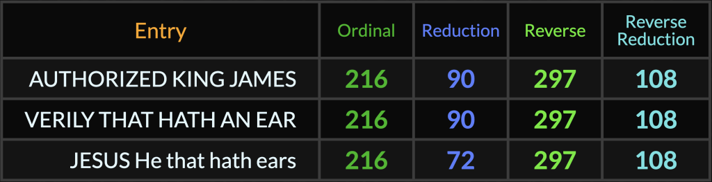I was also shown that “Jesus: He that hath ears” is a 3/4 gematria match to “Authorized King James” and “Verily That Hath An Ear”!!!