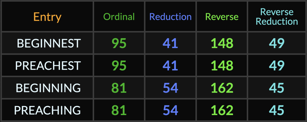 I was also shown that “Beginnest” is a perfect 4/4 gematria match to “Preachest”, just like “Beginning” exactly matches “Preaching” 🙂