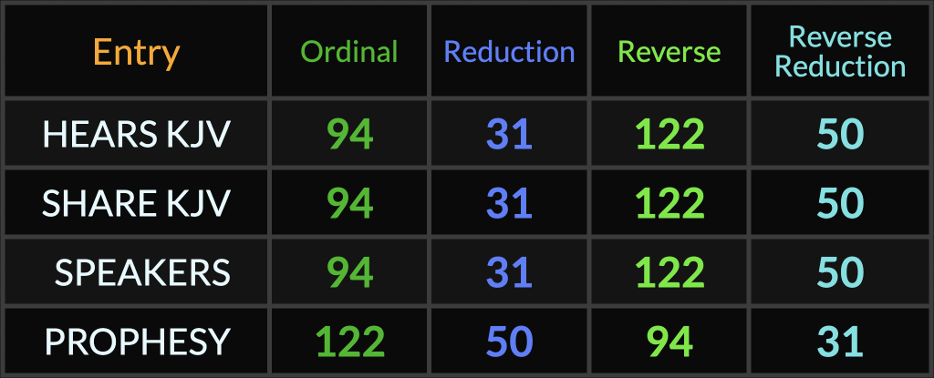 First, notice that “Hears KJV” and “Share KJV” are an EXACT 4/4 MATCH to “Speakers”! Think both about “people who speak to others”, and also about loudspeakers for home audio systems that come in stereo pairs so you can better use both ears to hear better compared to the inferior sound of thin sound bars which lack stereo separation and typically have inferior sound quality. Second, notice that the word “Prophesy” (verb) is also a perfect 4/4 match, but in reverse!
