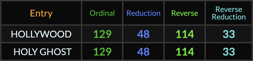 Also notice that “Hollywood” is an EXACT 4/4 MATCH to “Holy Ghost”! These are also the EXACT 4/4 FLIP of “Holocaust”!!!