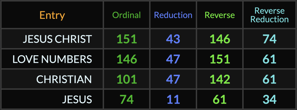 Notice that “Jesus Christ” is a perfect 4/4 gematria match to “Jesus is Born”, “Jesus is Lord”, and “Discussions”, the only single positive word I’ve found in the English language that perfectly matches “Jesus Christ”.