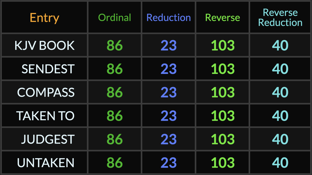 Notice that “KJV Book” is a perfect 4/4 gematria match to “Sendest”, “Compass”, “Taken To”, “Judgest”, and most importantly “Untaken”!