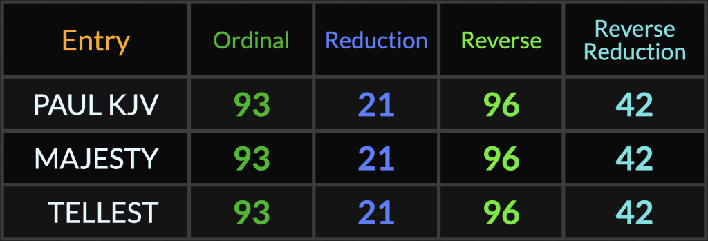 (Updated) Notice that “Praise Jesus” is a 3/4 gematria match to my full name “Paul James Cook”. I love that “Antennae” and “Jalapeno” are both a perfect 4/4 match to my name (minus the zero), and that the word “Preacher” is also a 3/4 match to my name! (“Speakers” is also a 3/4 match to “Paul Cook”.)