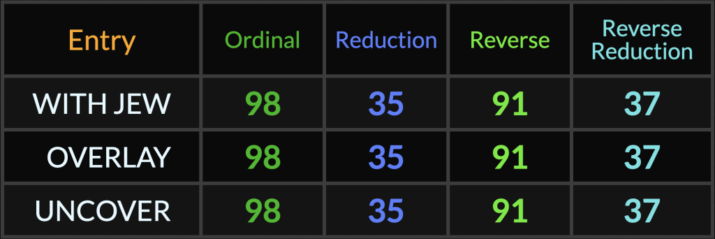 There’s a number thirty eight in both “Jew” and “KJV” but on OPPOSING SIDES, as well as the number forty three for “Jesus Christ” being on OPPOSING SIDES! That completely explains the plethora of attacks on The KJV Bible which I will fully expose on this website!