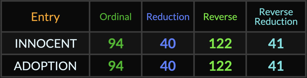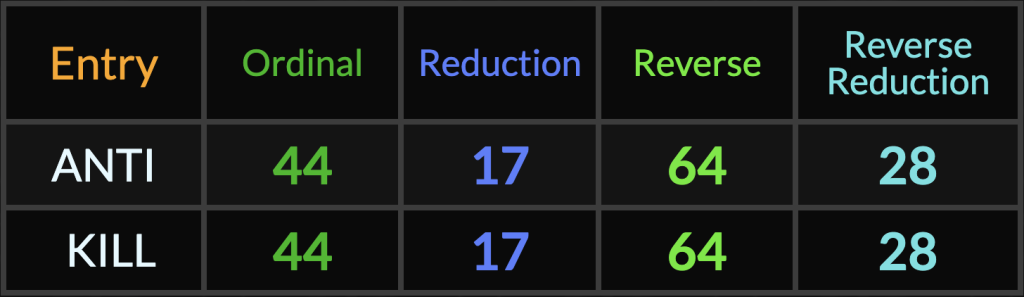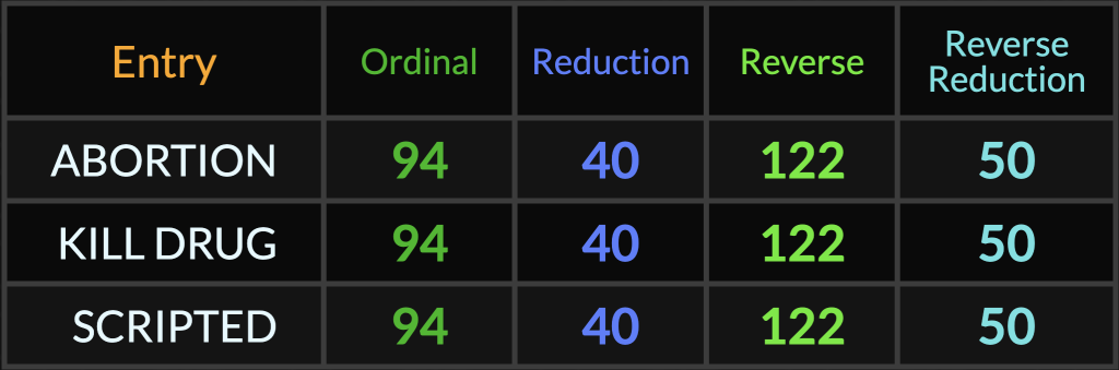 This truly saddened and angered me. As you can see, “Abortion” is a perfect 4/4 gematria match to “Kill Drug” and “Scripted”, as well as “Kill Hers”, “Kills Her”, “Her Skill”, “Kill Pink”, “Kill Role”, “Kill Lion”, “Kill Nazi”, “Arrogant”, “Betrayal”, and one positive word –“Vigilant”.