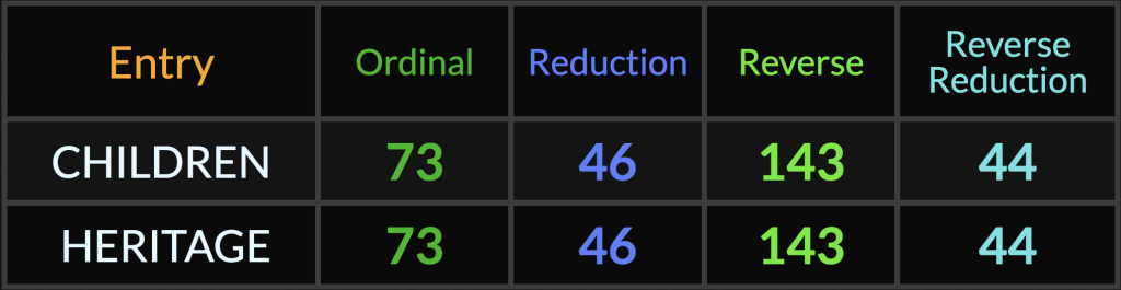 Notice that “Children”and “Heritage” are a perfect 4/4 gematria match to each other!