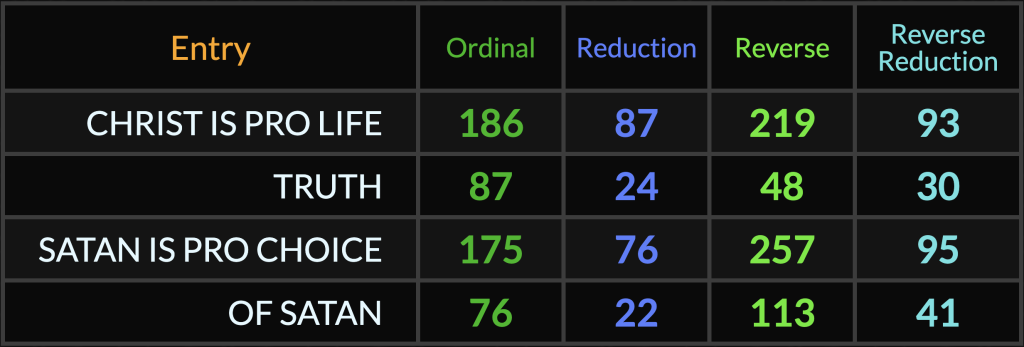 Notice the matching number 87 for “Christ Is Pro Life” and “Truth”, and the matching number 76 for “Satan Is Pro Choice” and “Of Satan”.