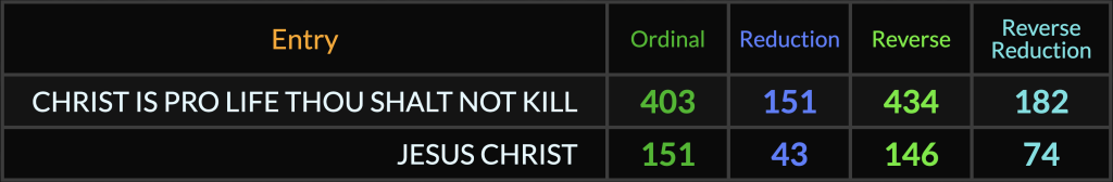 Notice that “Christ Is Pro Life, Thou Shalt Not Kill” and “Jesus Christ” both share the number 151 and 403/43 on the left side (you can ignore zeroes when comparing numbers in gematria).