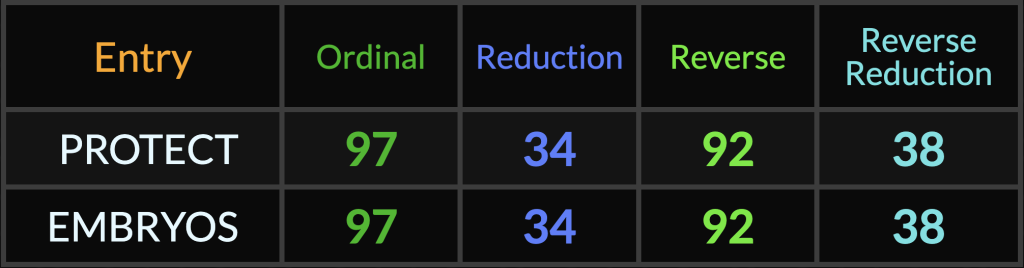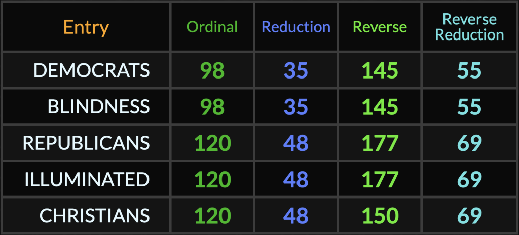 I am apolitical, but I found the above gematria very interesting. As you can see, “Democrats” is a perfect 4/4 match to “Blindness”, and “Republicans” is a perfect match to “Illuminated” and 3/4 match to “Christians”. This explains the two main party platforms regarding the abortion issue, which is not really a political issue. It is a morality issue.