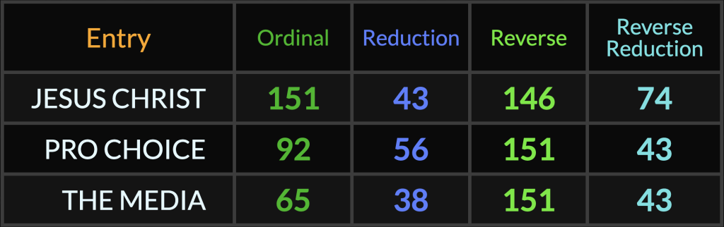 Notice that the numbers 151 and 43 for “Jesus Christ” are on the FLIP SIDE for “Pro Choice” and “The Media”.