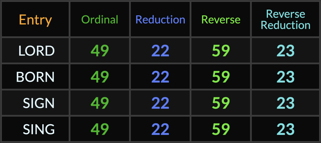Notice that the word “Lord” is an exact 4/4 gematria match to the word “Born”, as are “Sign” and “Sing”.