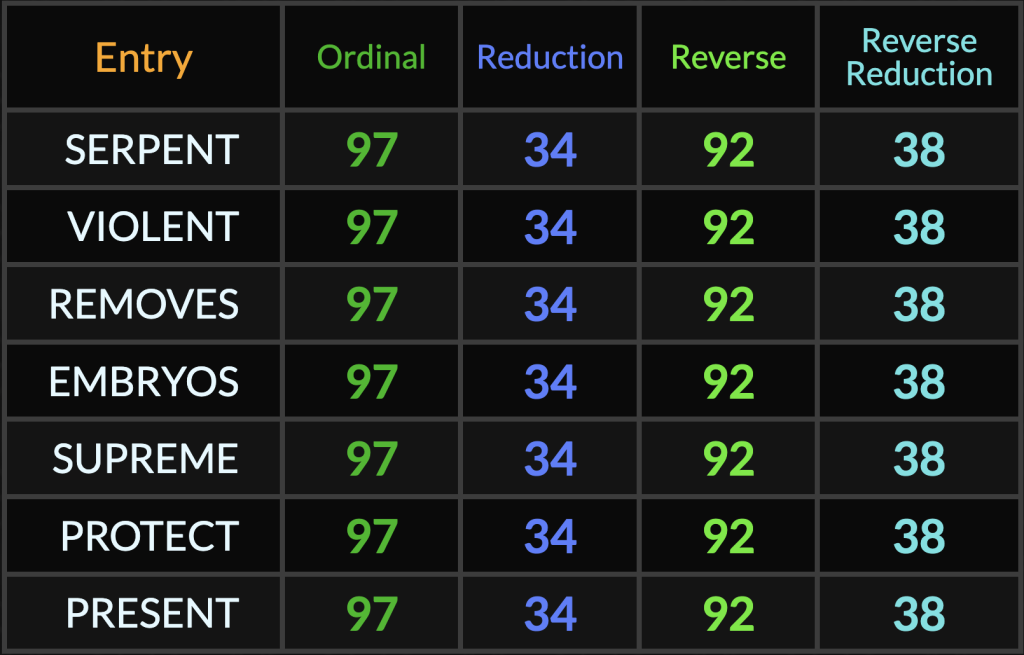 Here’s some food for thought and prayer. Notice that “Serpent”, “Violent”, “Removes”, and “Embryos” are all a perfect 4/4 match to each other, as are “Supreme”, “Protect”, and “Present”.