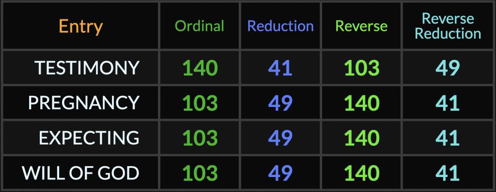 Notice that “Pregnancy”, “Expecting”, and “Will Of God” are all a perfect 4/4 gematria match to each other!!!