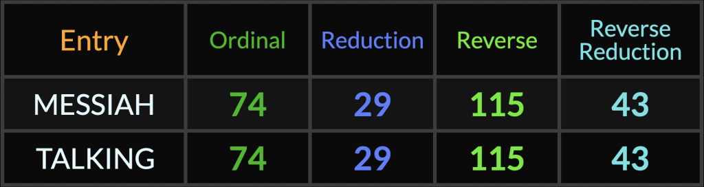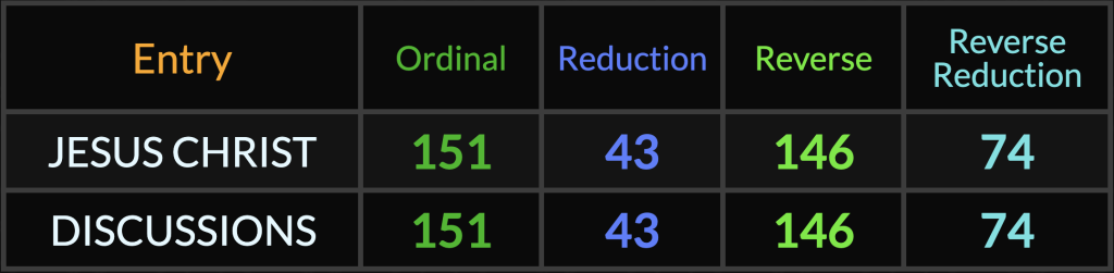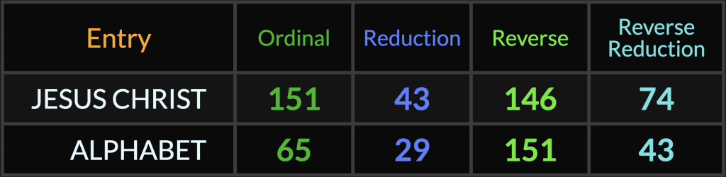 Notice that “Jesus Christ” and “Alphabet” both share the numbers 151 and 43.