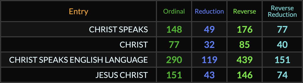 Next, notice “Christ Speaks” shares the number 77 with “Christ”, as does “Christ Speaks English Language” shares the number 151 with “Jesus Christ”. Jesus Christ spoke the red text in the King James New Testament.