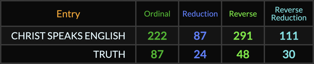 “Christ Speaks English” shares the number 87 on the left side with “Truth”.