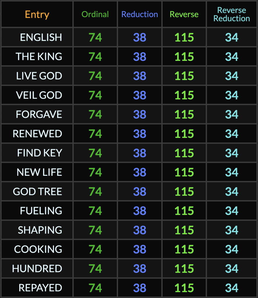 Notice that “English” is a perfect 4/4 gematria match to “The King”, “Live God”, “Veil God”, “Forgave”, “Renewed”, “Find Key”, “New Life”, “God Tree”, “Fueling”, “Shaping”, “Cooking”, “Hundred”, and “Repayed”. More will be added in the future as I remember or discover them.