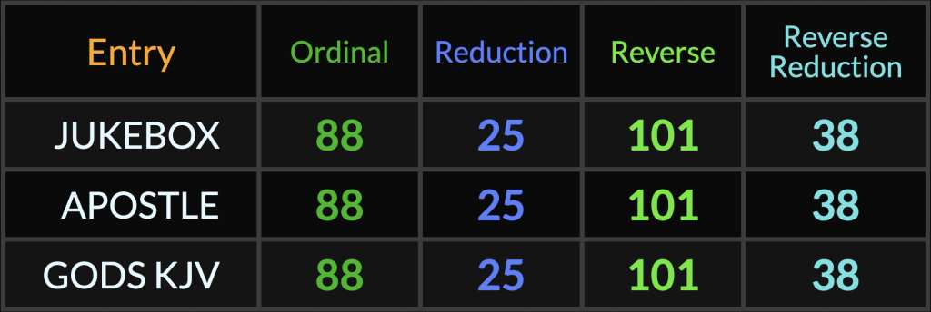 As a Follower of Christ who is also a music lover and song lyric gematria decoder, I love that the word “Jukebox” is an exact 4/4 match to “Apostle” and “God’s KJV”!