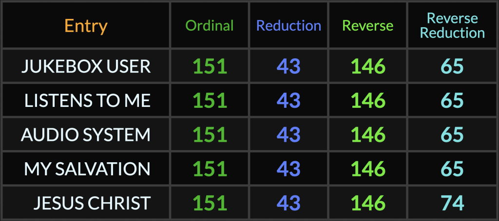 Lastly for now, notice that “Jukebox User” is a perfect 4/4 gematria match to “Listens To Me”, “Audio System”, and “My Salvation” which are all a 3/4 match to “Jesus Christ”!