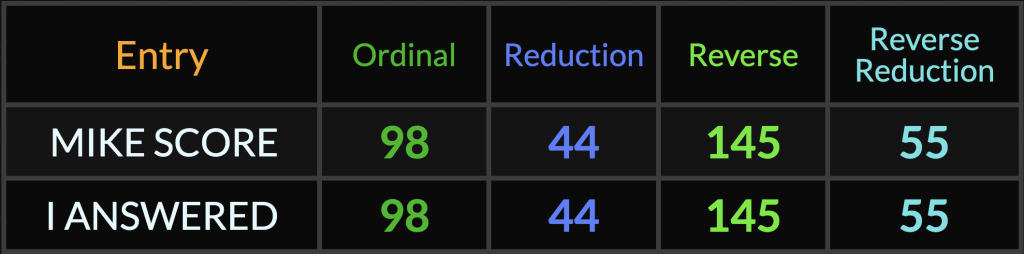 Also notice that “Mike Score” is a perfect 4/4 match to “I Answered”! (My wife and I were lucky enough to get to meet him and hang out with him and his bandmates backstage after a concert a few decades ago. He was one of the nicest musicians I’ve ever met.)