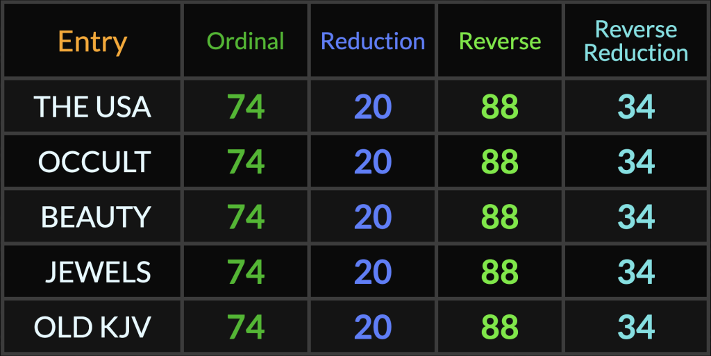 Notice that “The USA” is an exact 4/4 gematria match to “Occult” (which means hidden or secret), “Beauty”, “Jewels”, and “Old KJV”!